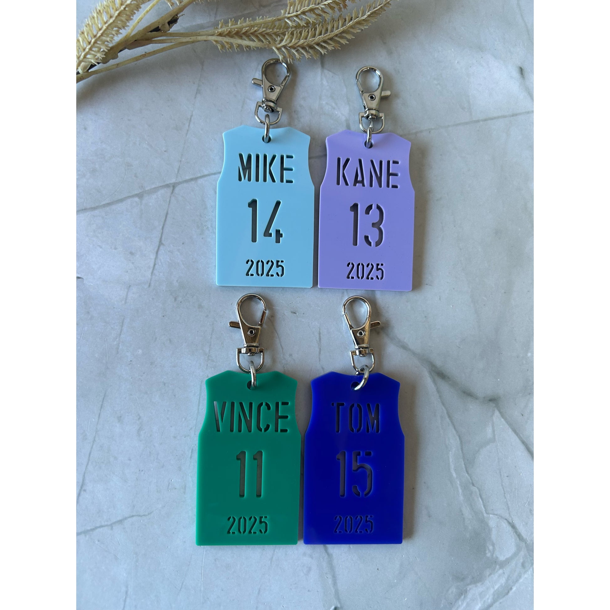 Personalise each keychain with the players name (SINGLE NAME), number and year. Each keychain is single layered and made using the one STENCIL FONT
