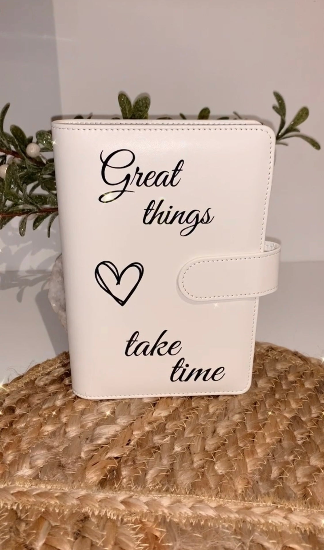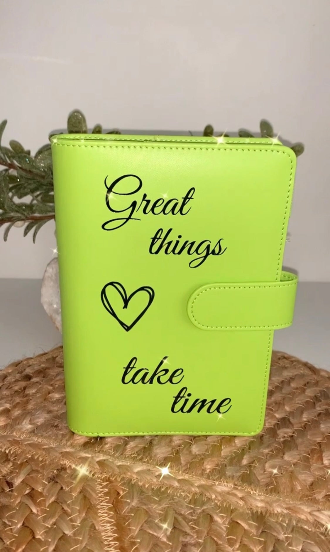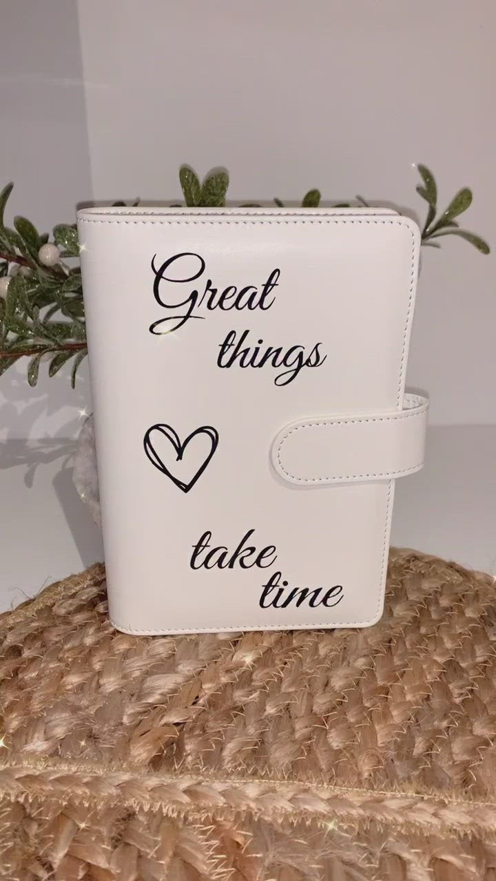 Choose from a variety different coloured binders and start saving today! Each binder comes with 5 personalised plastic inserts. Customise each insert with different saving goals, eg. Rent, Savings, Holiday Fund, Tattoo Fund etc.