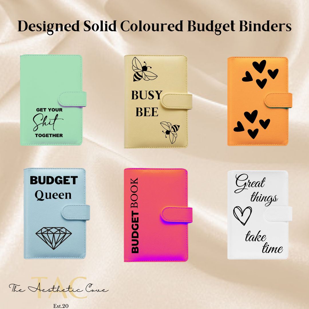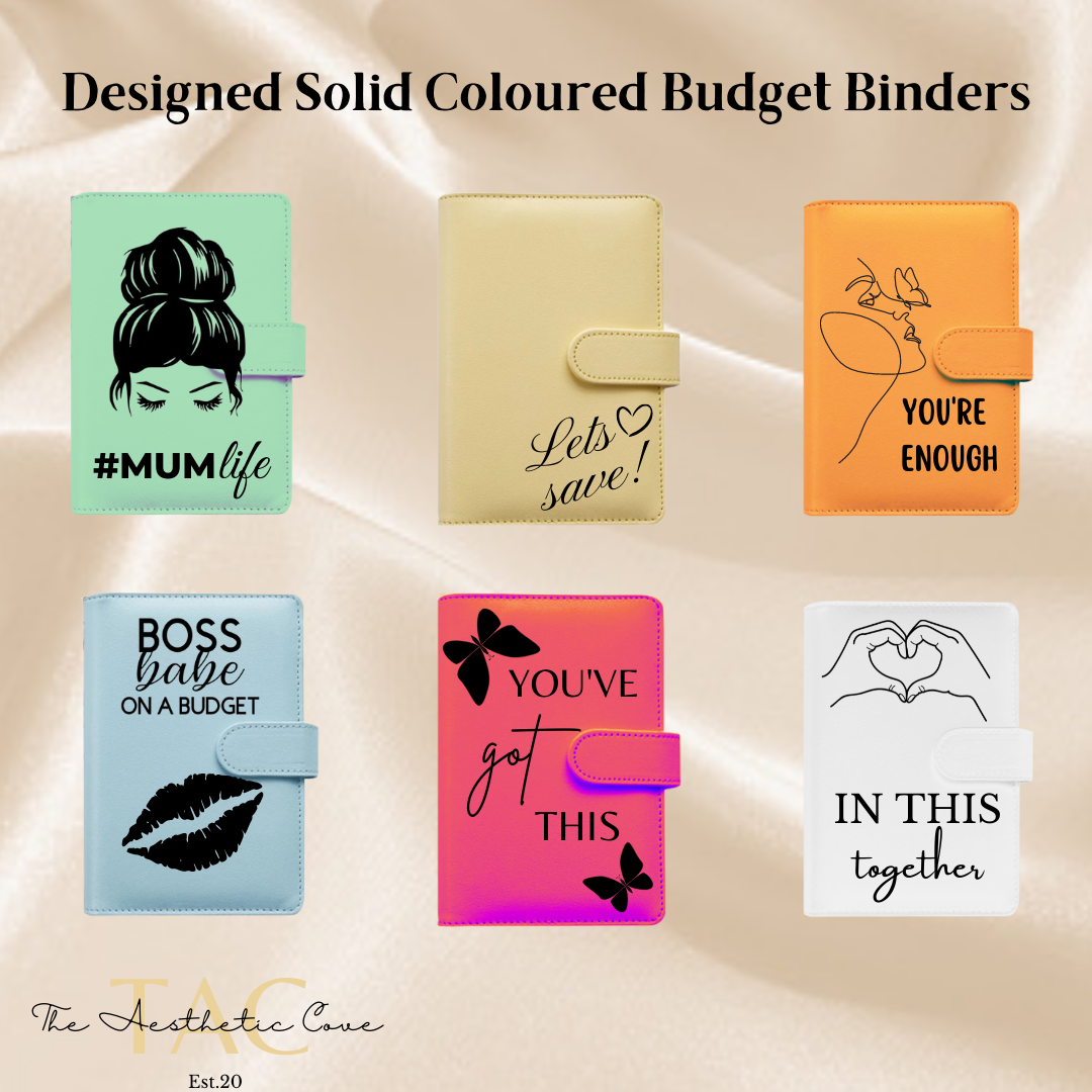 Select from 12 different designs along with the desired font colour. The chosen design will be then applied to your chosen coloured budget binder.