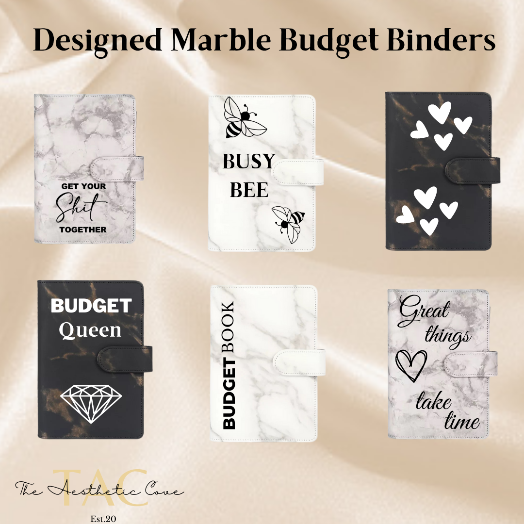 Choose from 5 different marble binders and start saving today! Each binder comes with 5 personalised plastic inserts. Customise each insert with different saving goals, eg. Rent, Savings, Holiday Fund, Tattoo Fund etc.