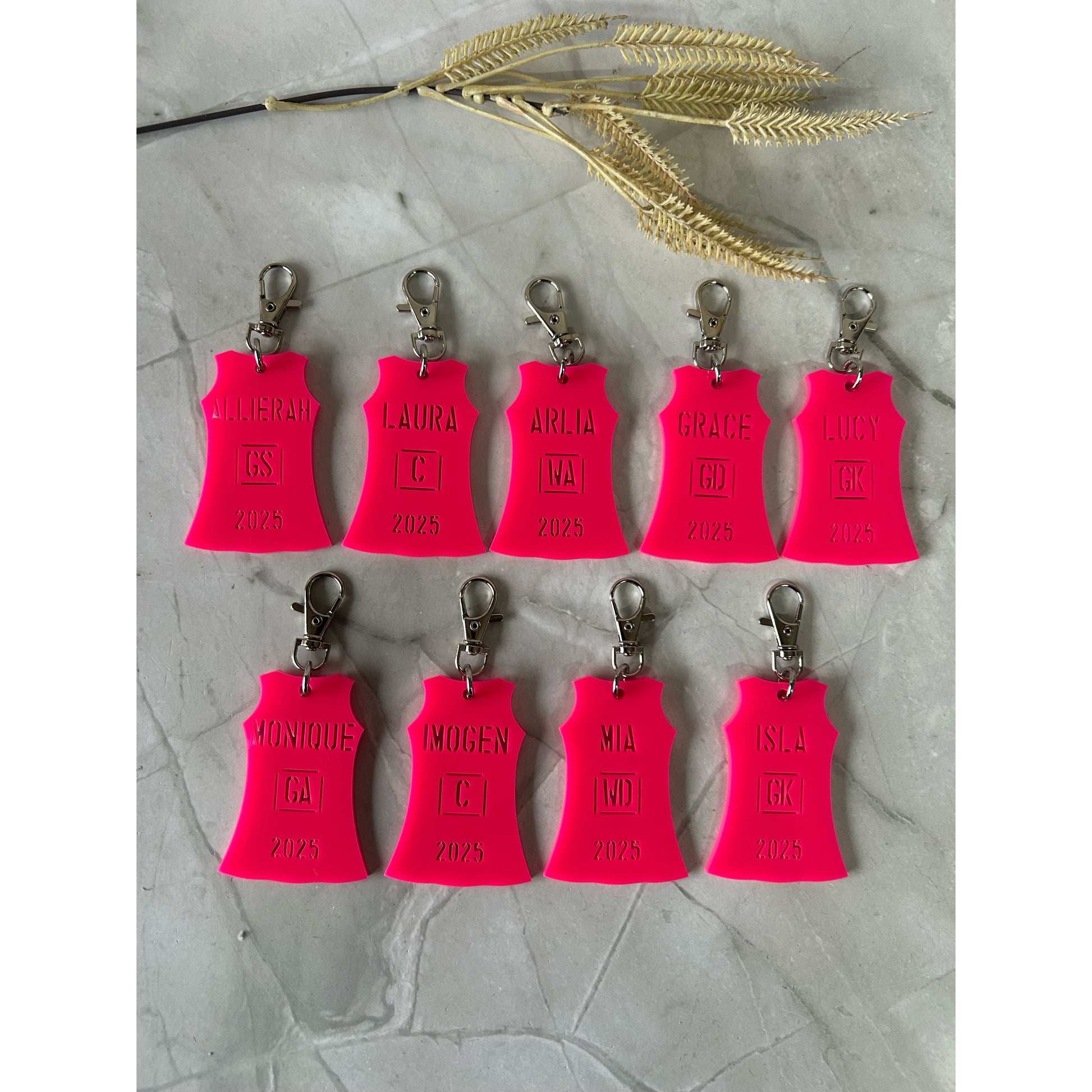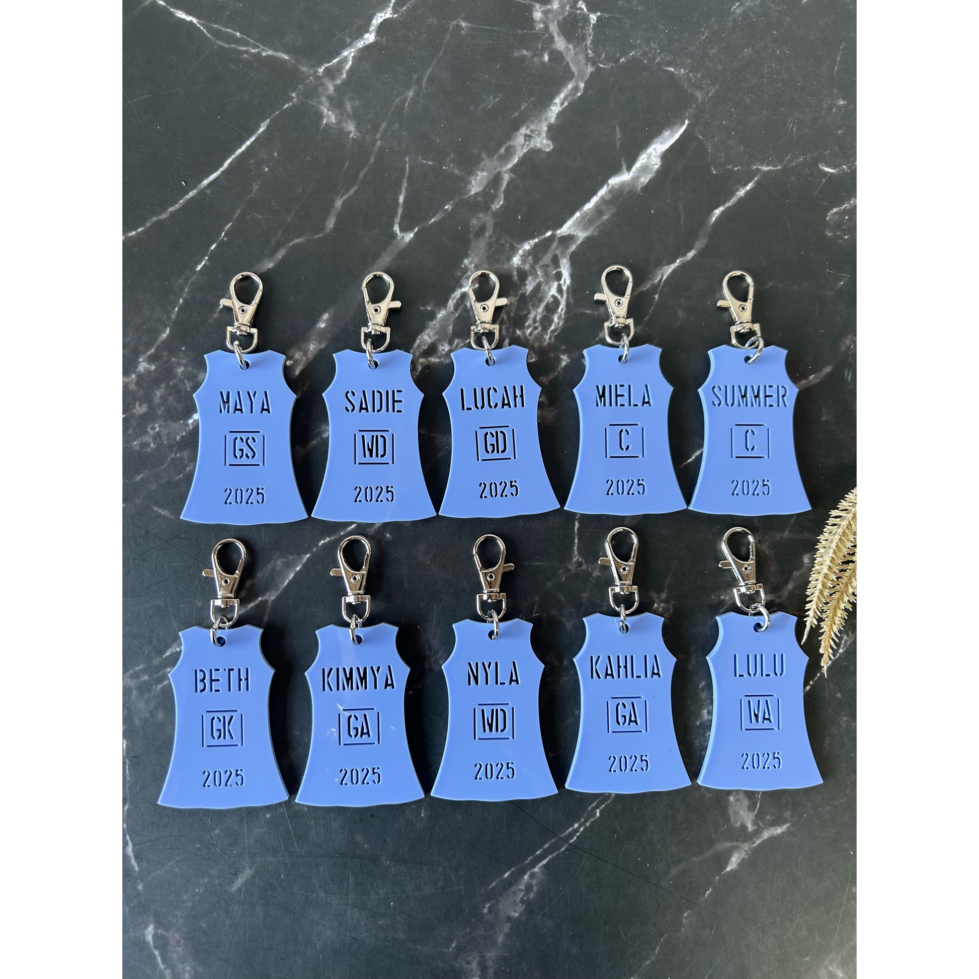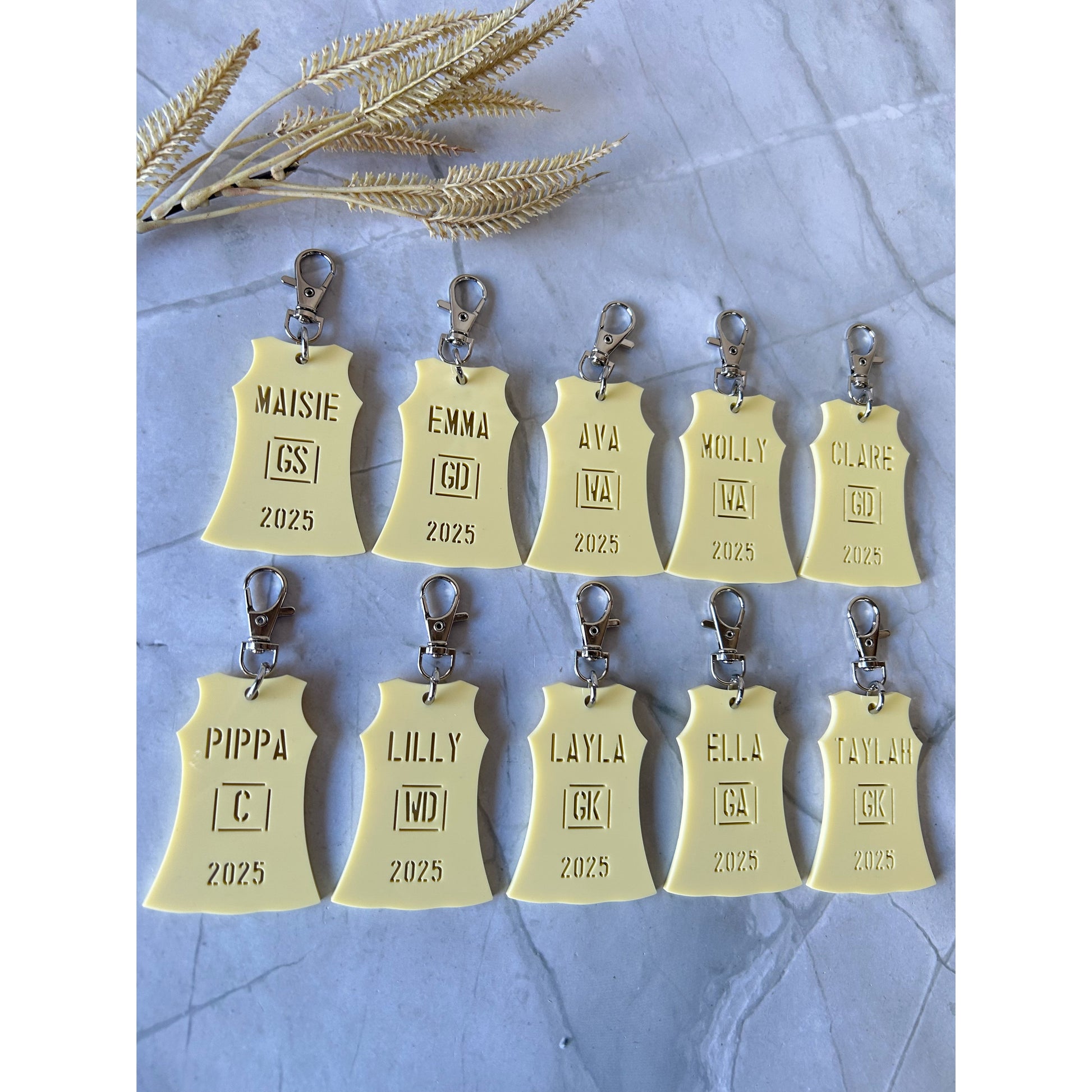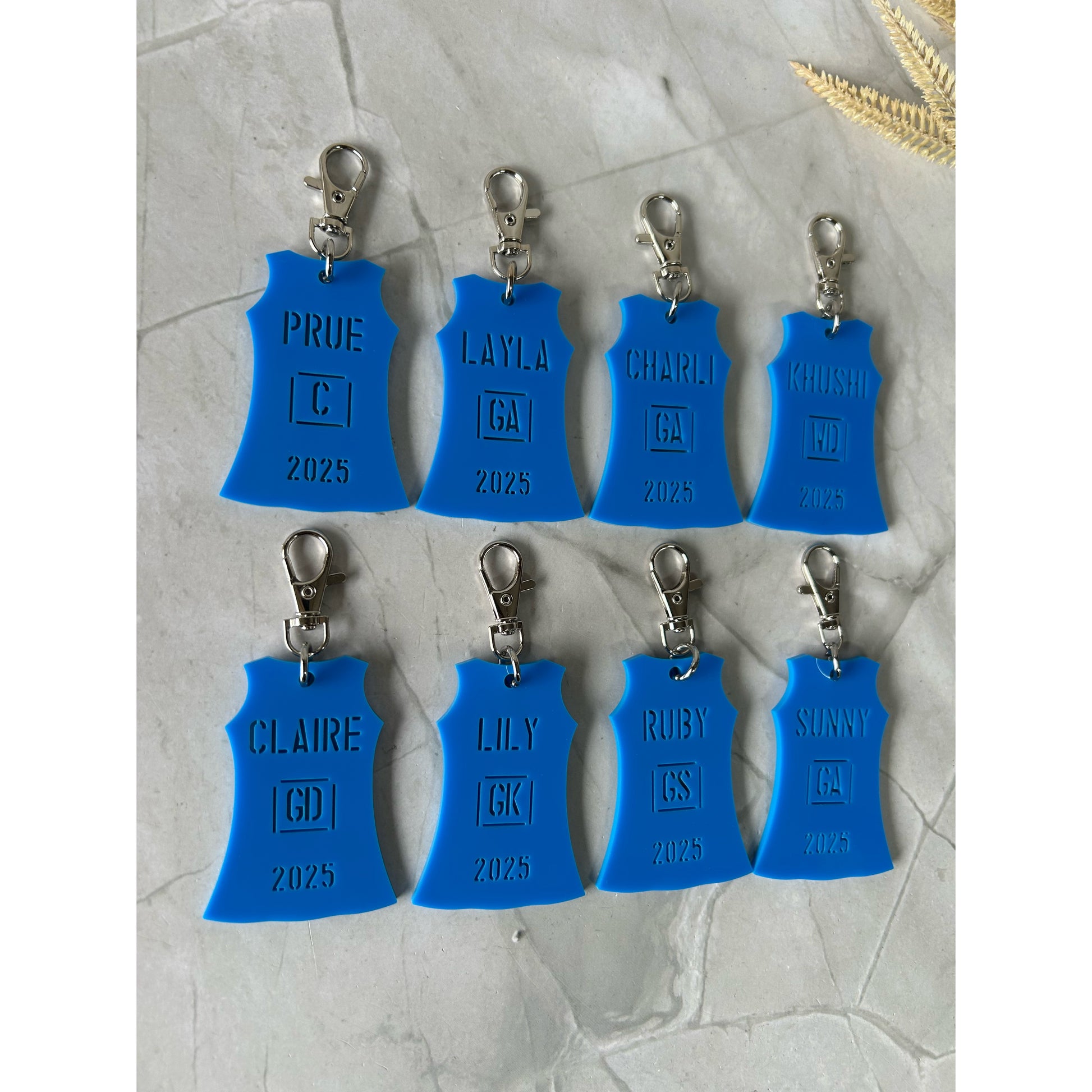 NOTE: These bag tags are the same size and shape as our normal mirrored netball dress keychains, the only difference is they're single layered, wordings are cut out not engraved, and have only the year at the bottom