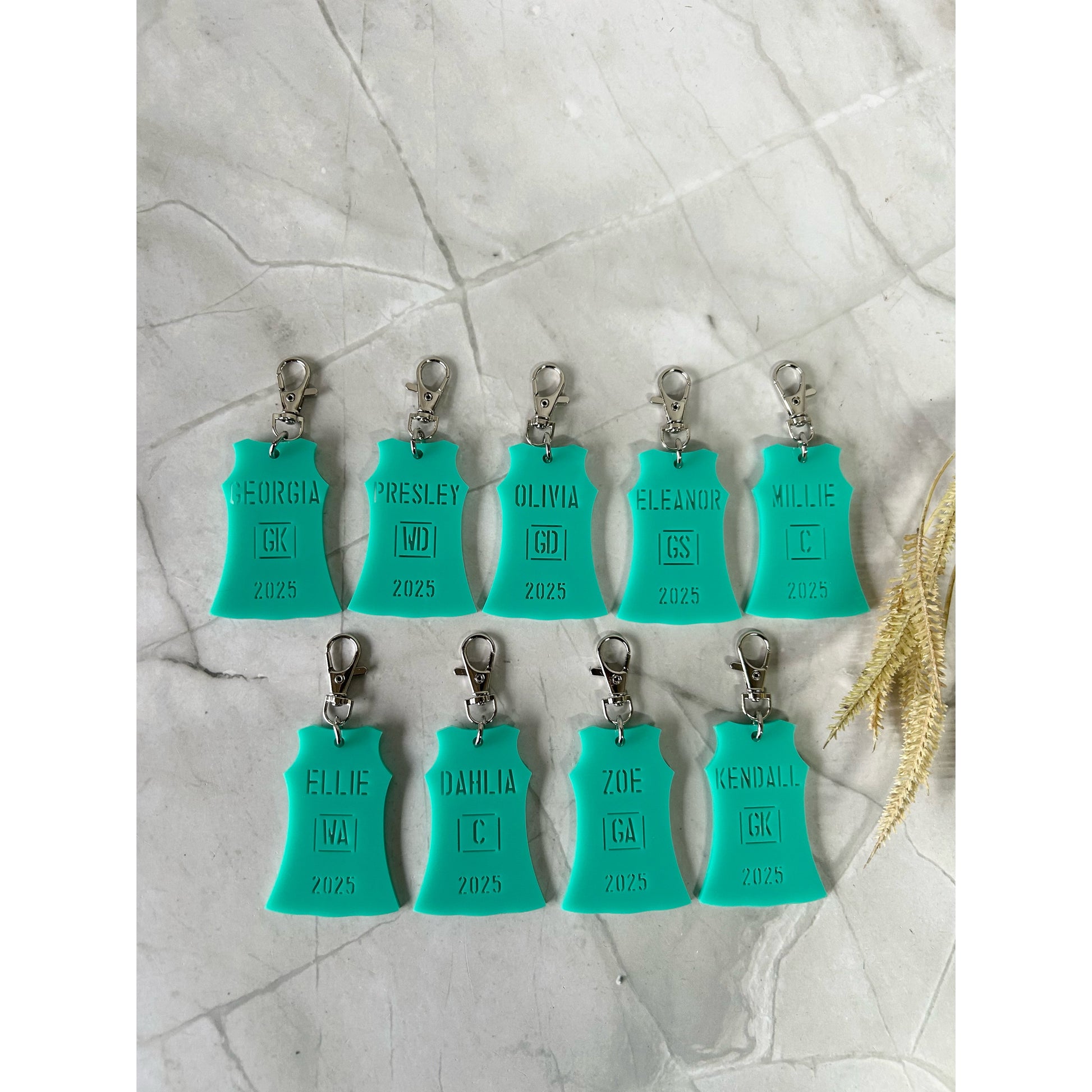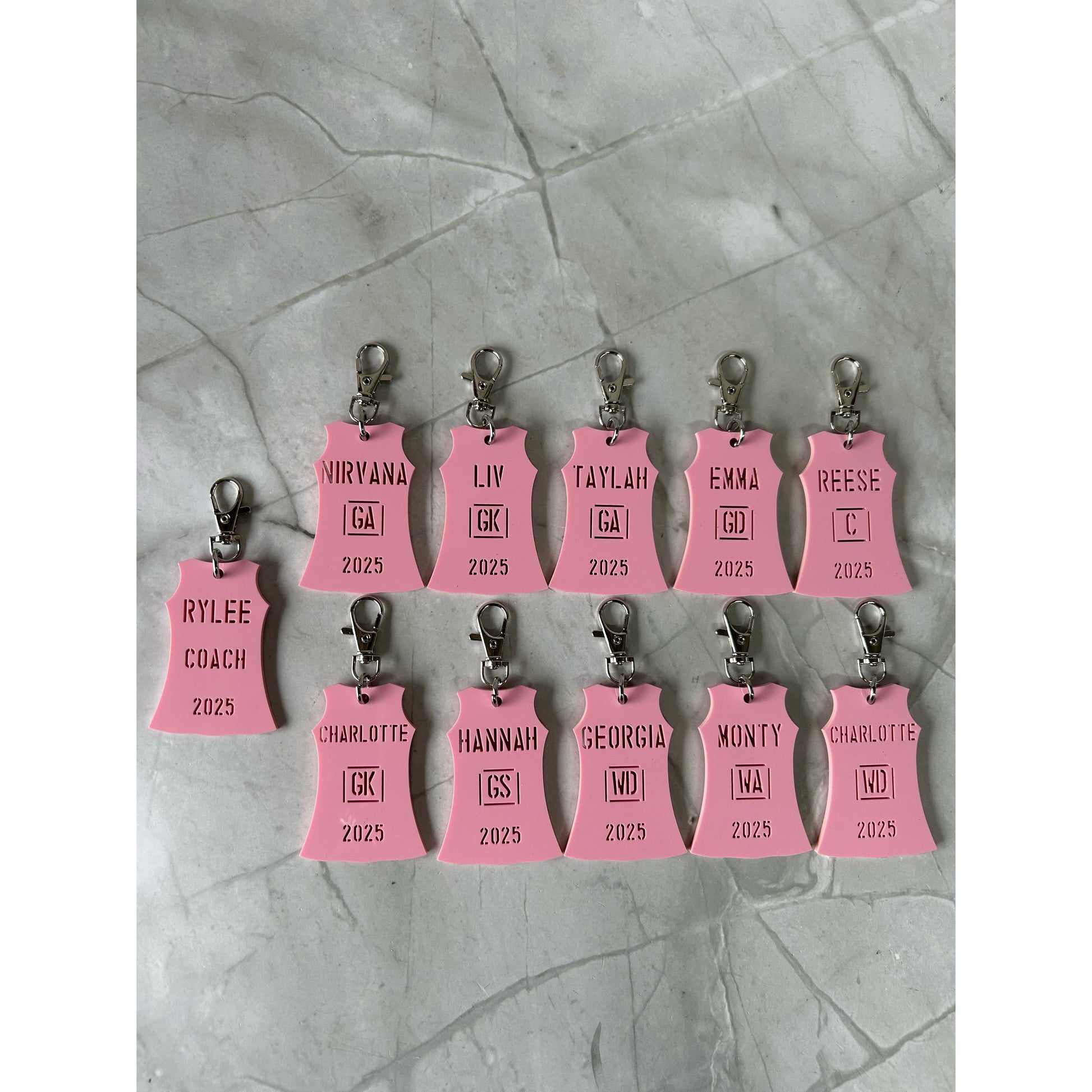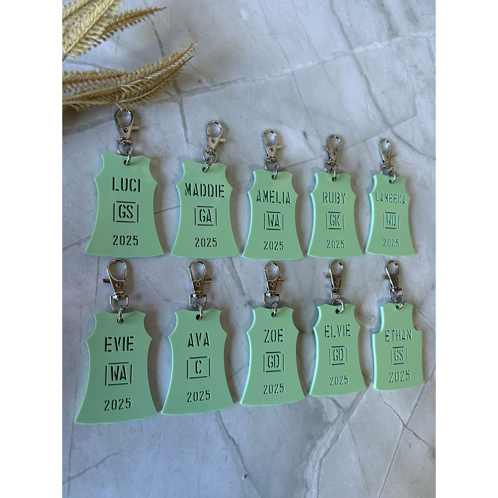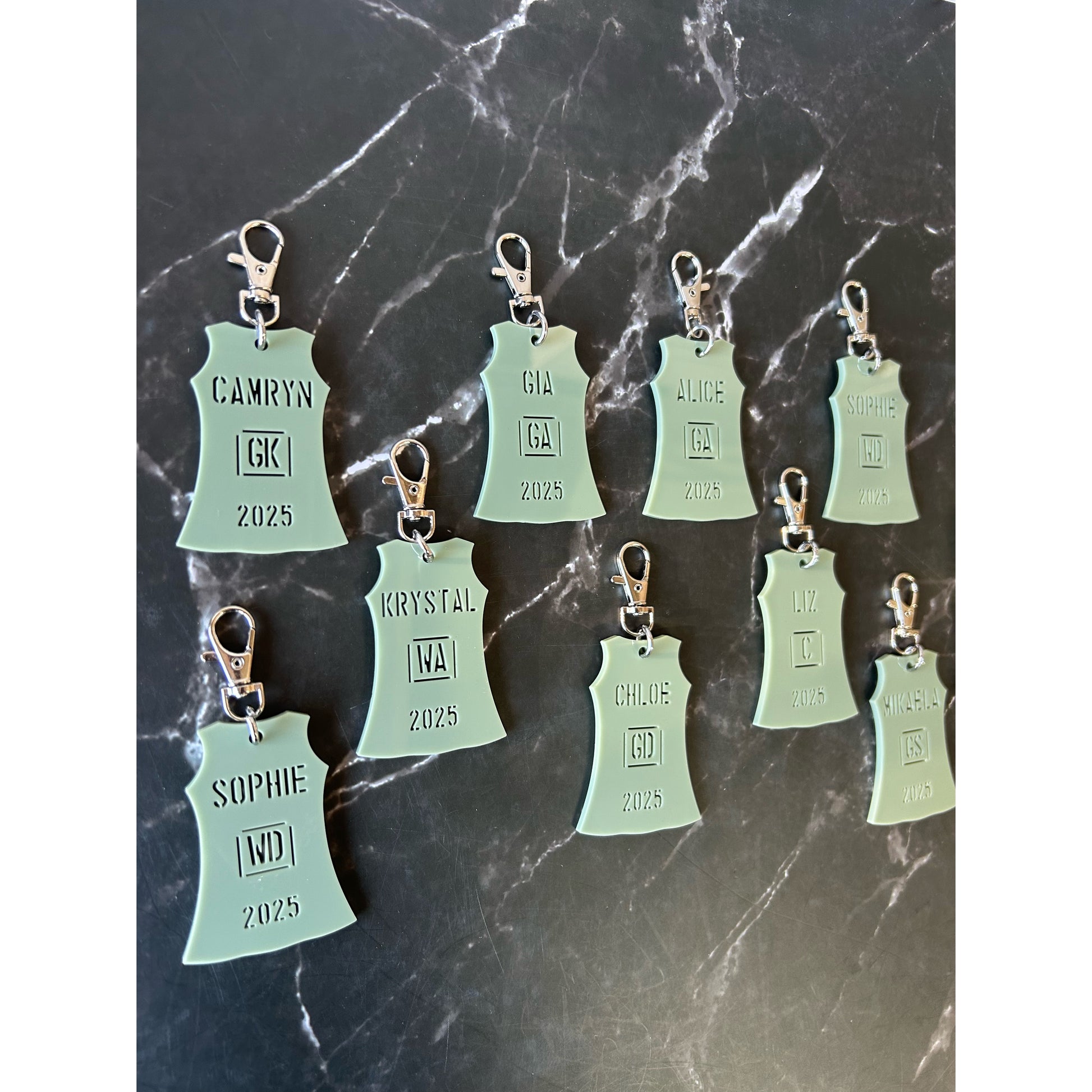 NOTE: These bag tags are the same size and shape as our normal mirrored netball dress keychains, the only difference is they're single layered, wordings are cut out not engraved, and have only the year at the bottom