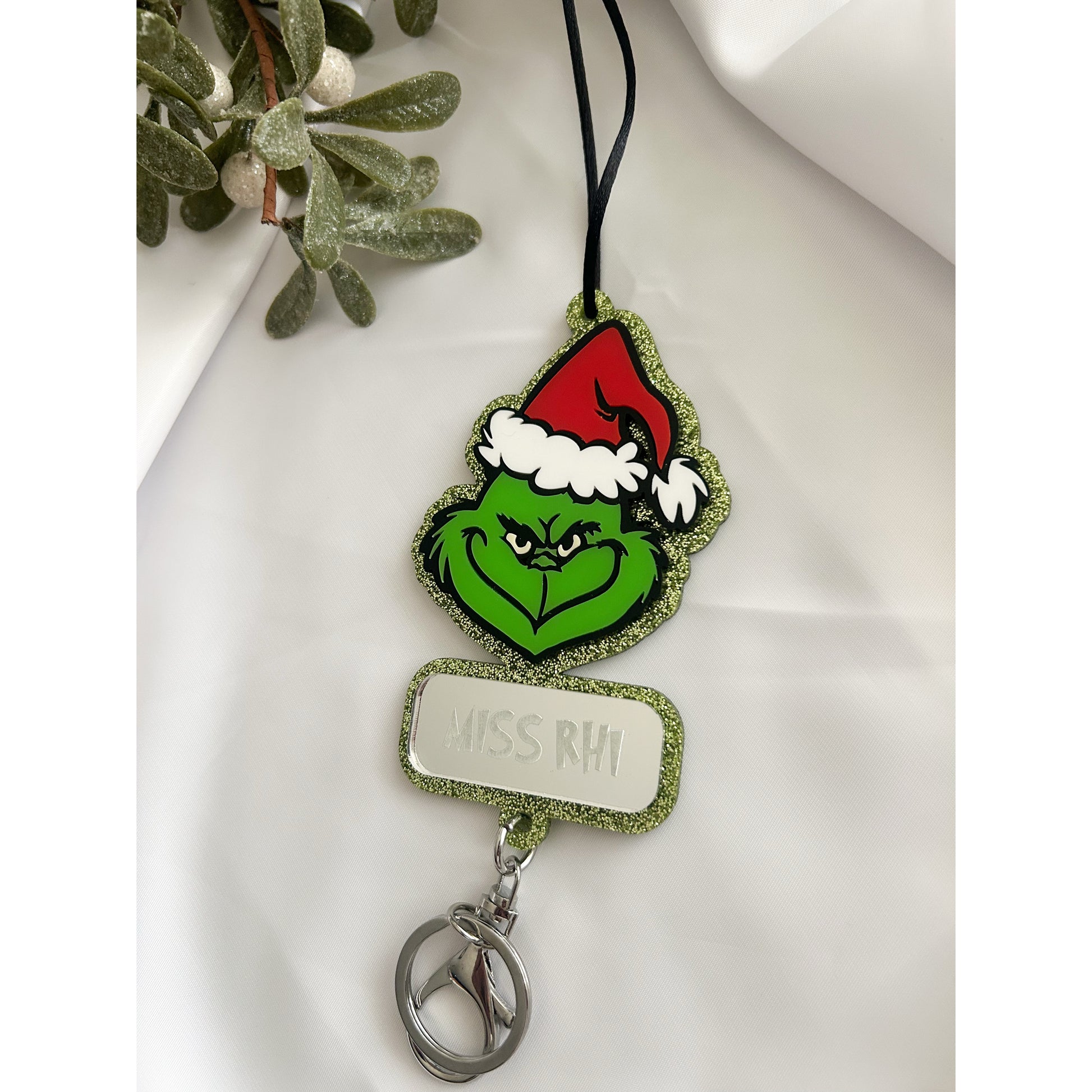 Featuring a fun Grinch-inspired acrylic face, each lanyard is personalised with your name for that extra touch of holiday magic. Ideal for teachers, staff, or anyone who wants to spread a little mischievous Christmas cheer this season.