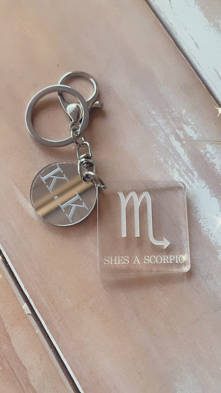 Our clear acrylic pieces are engraved with any star sign symbol and attached with a double layered mirrored charm, engraved with initials.